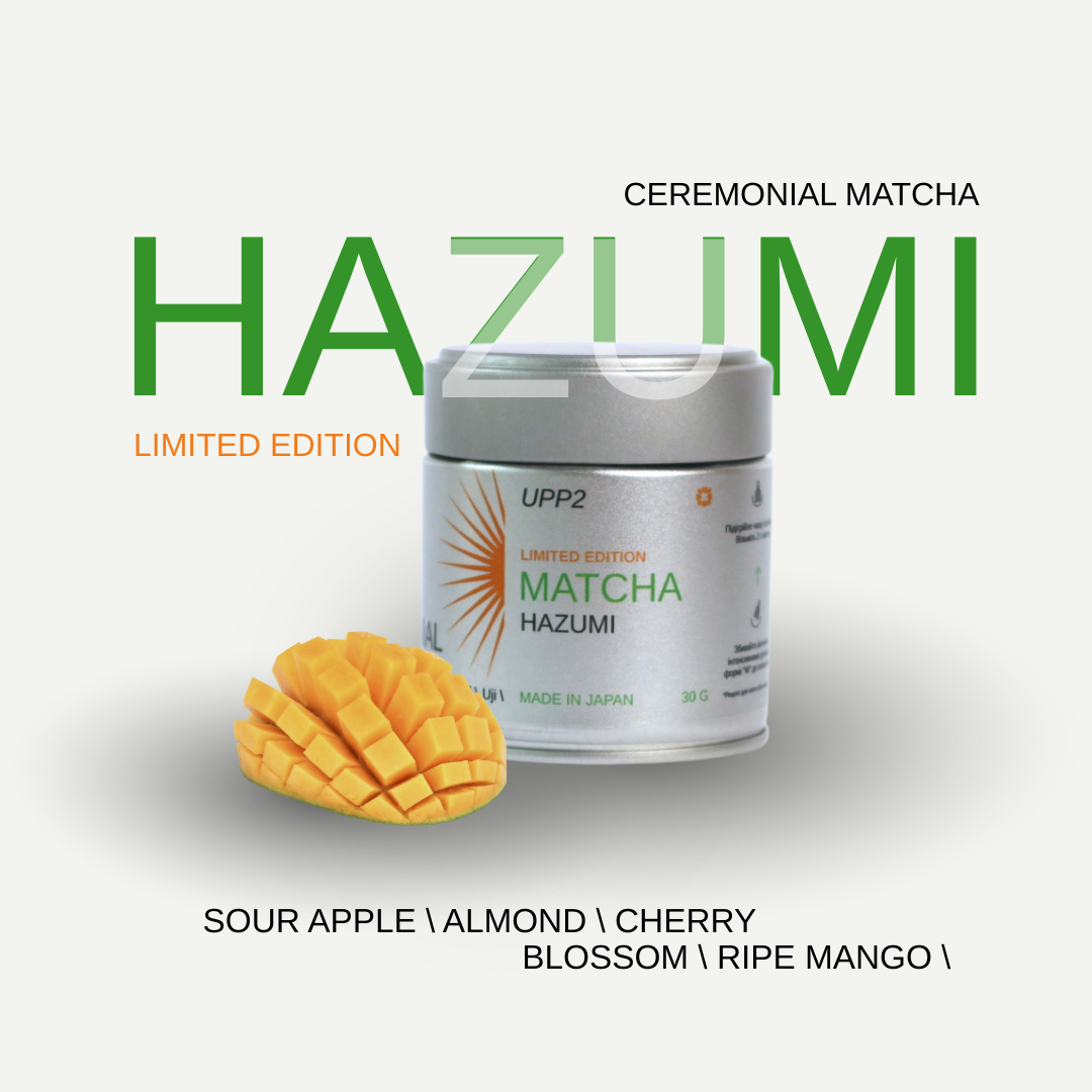 Завдяки помолу на бісерному млині, Hazumi має шовковисту текстуру, глибокий зелений колір і ніжну стійку піну. Смак — збалансований, з приємною кислинкою та глибоким умамі, який розкривається як у класичному приготуванні усучі чи койча, так і в матча латте, десертах або авторських напоях.