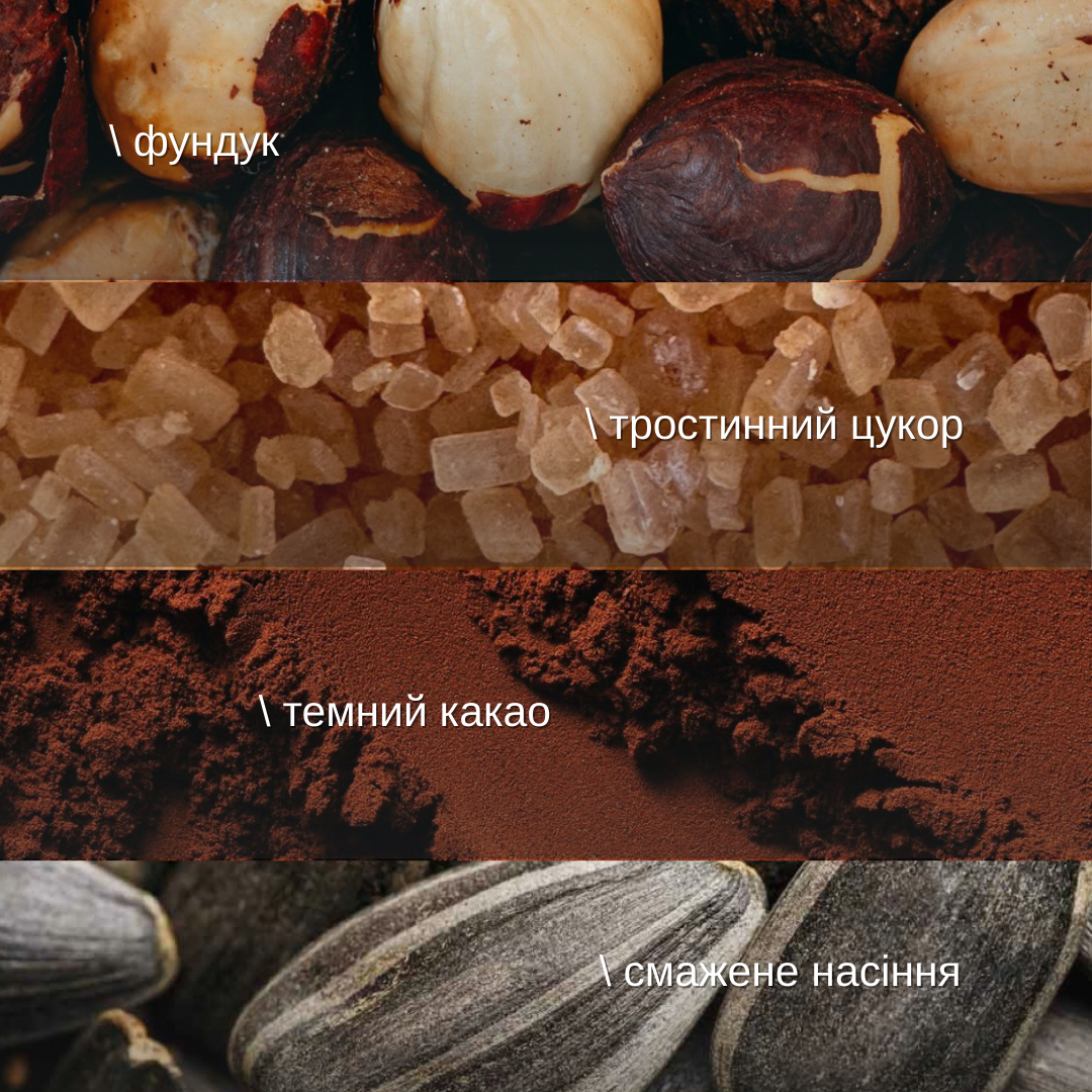 смажене насіння соняшника ,темний какао ,тростинний цукор ,фундук |