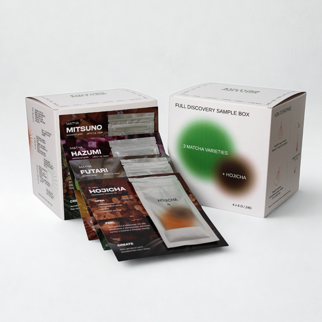 FULL DISCOVERY SAMPLE BOX — це дегустаційний набір, створений для знайомства з майже всім асортиментом Kultura Matcha.